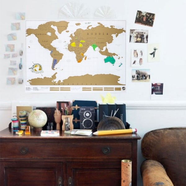 A differenza della cartina del mondo da grattare, questa mappa del mondo è in sughero ed è ideale per attaccare spille e appendere foto, cartoline o biglietti aerei dei propri viaggi. Io ne ho avuta una simile per anni nella mia cameretta: era il mio diario-a-parete e scoppiava letteralmente di miei viaggi.